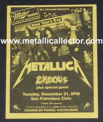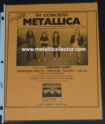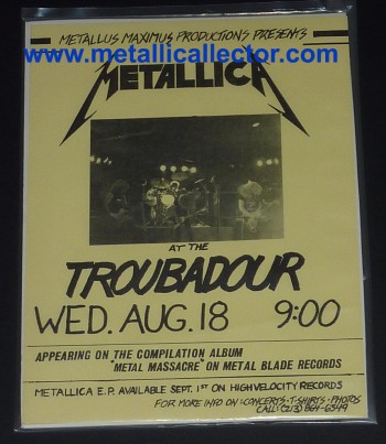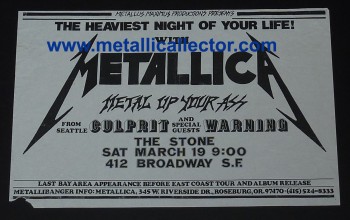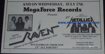 Metallica concerts were promoted and advertised in all shapes and sizes. Ron McGovney & Lars Ulrich drew up many of the early show fliers, using the Metallica logo that James Hetfield had designed. Later on the clubs did most of the promoting. Once Metallica was signed by Megaforce Records, the band no longer had to handle their own promoting. The original concert fliers below are from 1982 through 1986. I have many other photocopies of early Metallica concert fliers as well.